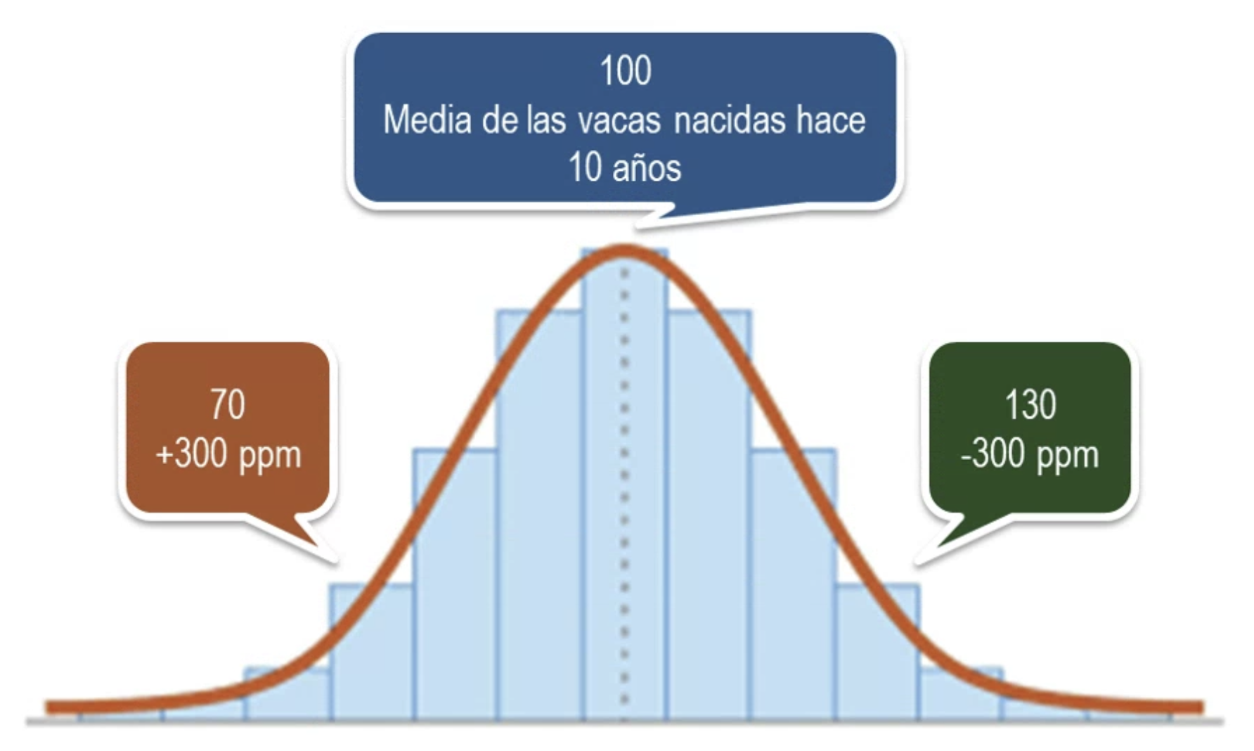 Las evaluaciones se publican con Base 100 y Desviación típica 10 correspondiendo el 100 al valor genético medio de las vacas nacidas en 2013. Entre los animales 130 y los 70 se estiman unos 600 ppm de metano.