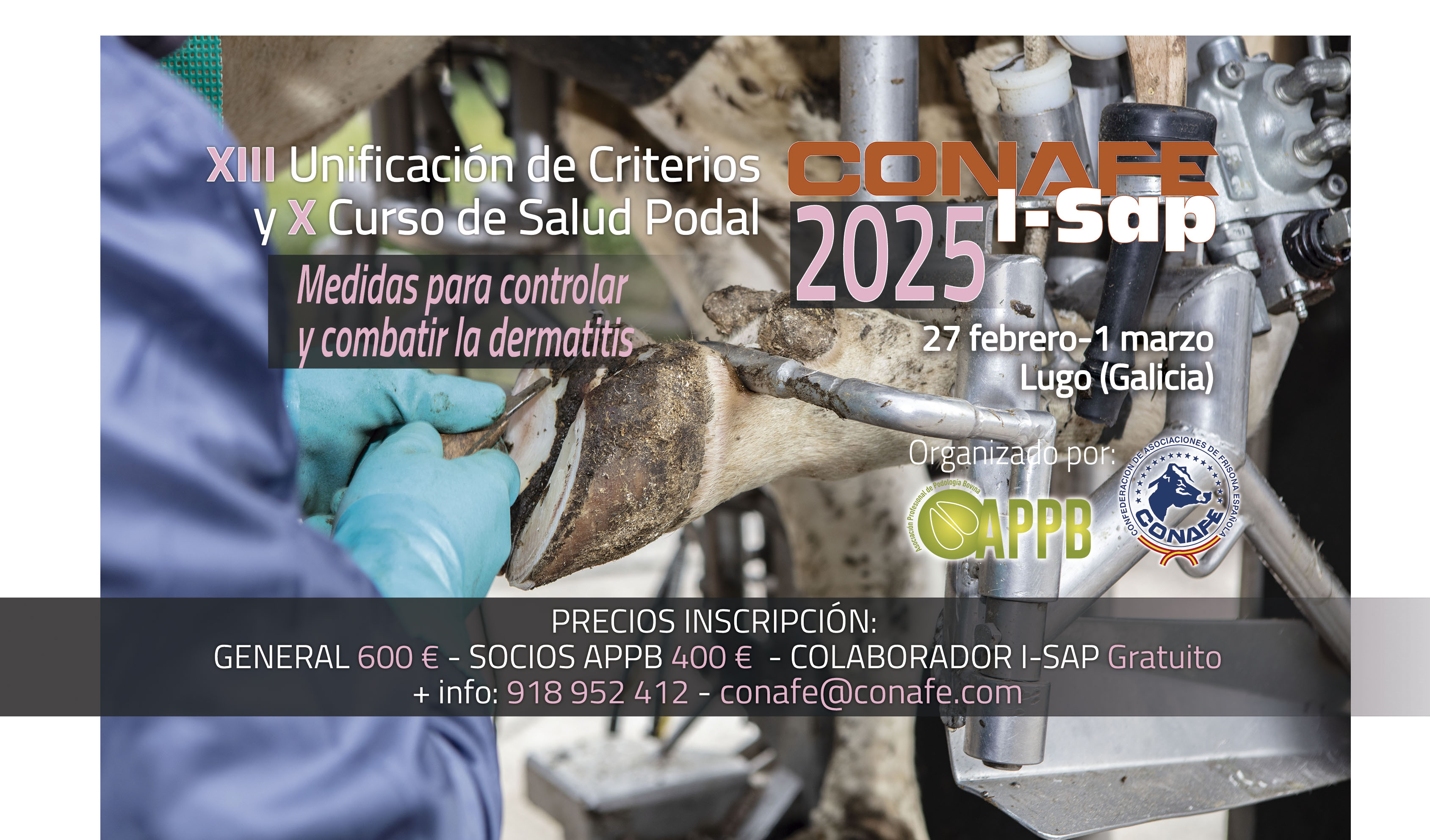 Ya está abierta la inscripción a las Jornadas I-SAP 2025, que celebrarán la XIII Unificación de criterios entre podólogos del Programa I-SAP el 27 de febrero y el X Curso de Podología Bovina de CONAFE y la APPB del 28 de febrero al 1 de marzo de 2025 en Lugo, dirigida a técnicos especialistas en podología bovina y una edición dedicada a las medidas para controlar y combatir la dermatitis.