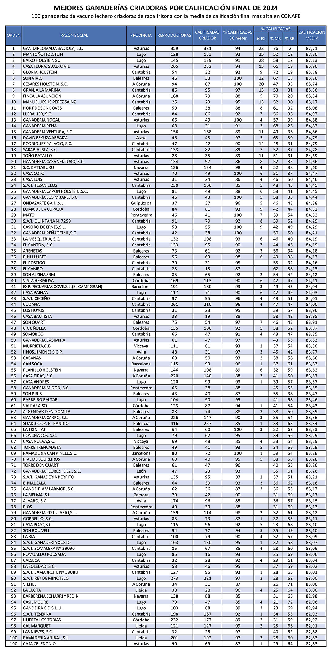 Relación de las 100 ganaderías criadoras de raza frisona con una media de calificación final más alta en CONAFE