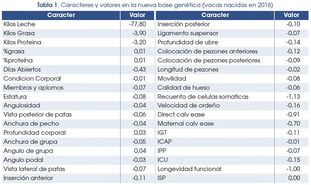 En esta evaluación, al ser la primera del año, se ha actualizado la base de la valoración genética, que ahora pasa a ser las vacas nacidas en 2016. El cambio por carácter se presenta en la Tabla 1: