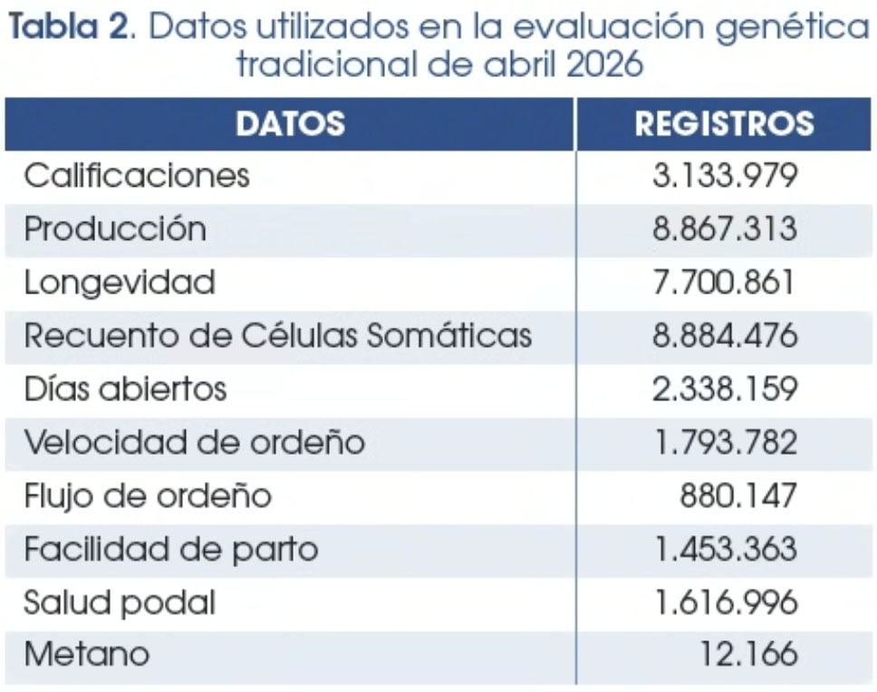 Para realizar la evaluación genética tradicional de abril 2026 se han utilizado los datos disponibles a finales de febrero, que son los que se muestran en la Tabla 2.