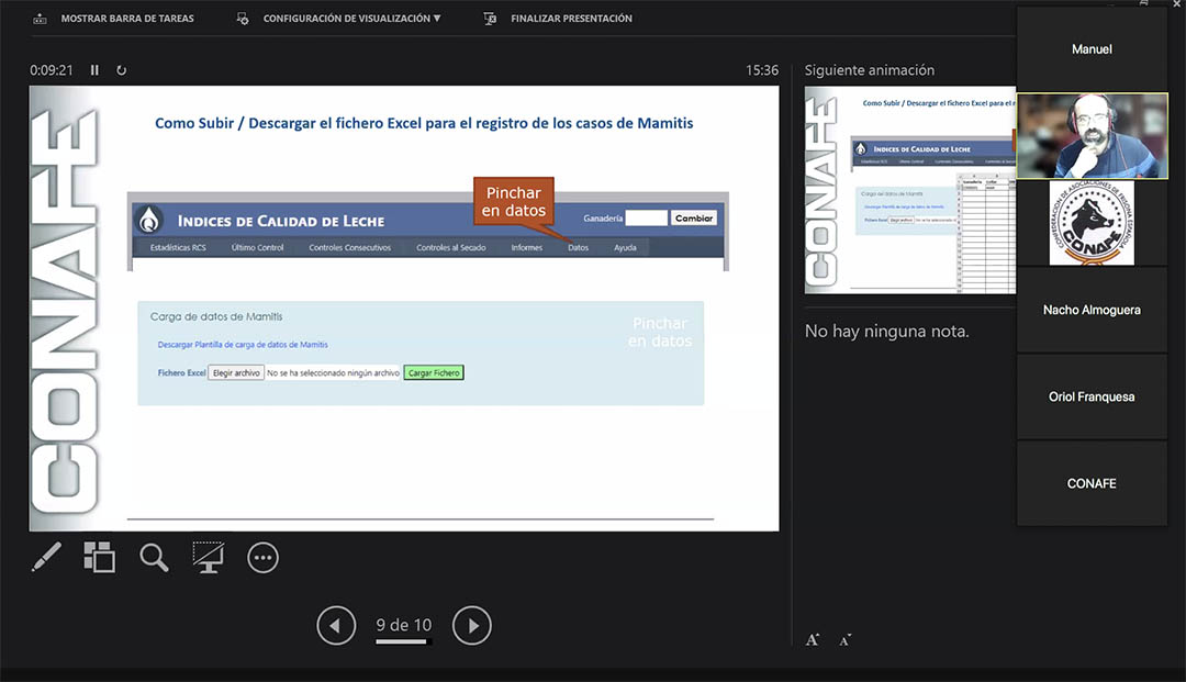 Tras la intervención de Franquesa, Nacho Almoguera, del Departamento TIC de CONAFE, tomó la palabra para hablar del proceso de actualización y validación de los 14 índices recogidos en el sistema. Explicó cómo entrar en la plataforma, con acceso restringido a los ganaderos y a los técnicos autorizados por estos, y cómo ha sido el proceso de creación del portal y del cálculo de los distintos índices a partir de los datos remitidos por las asociaciones y organismos de control lechero.